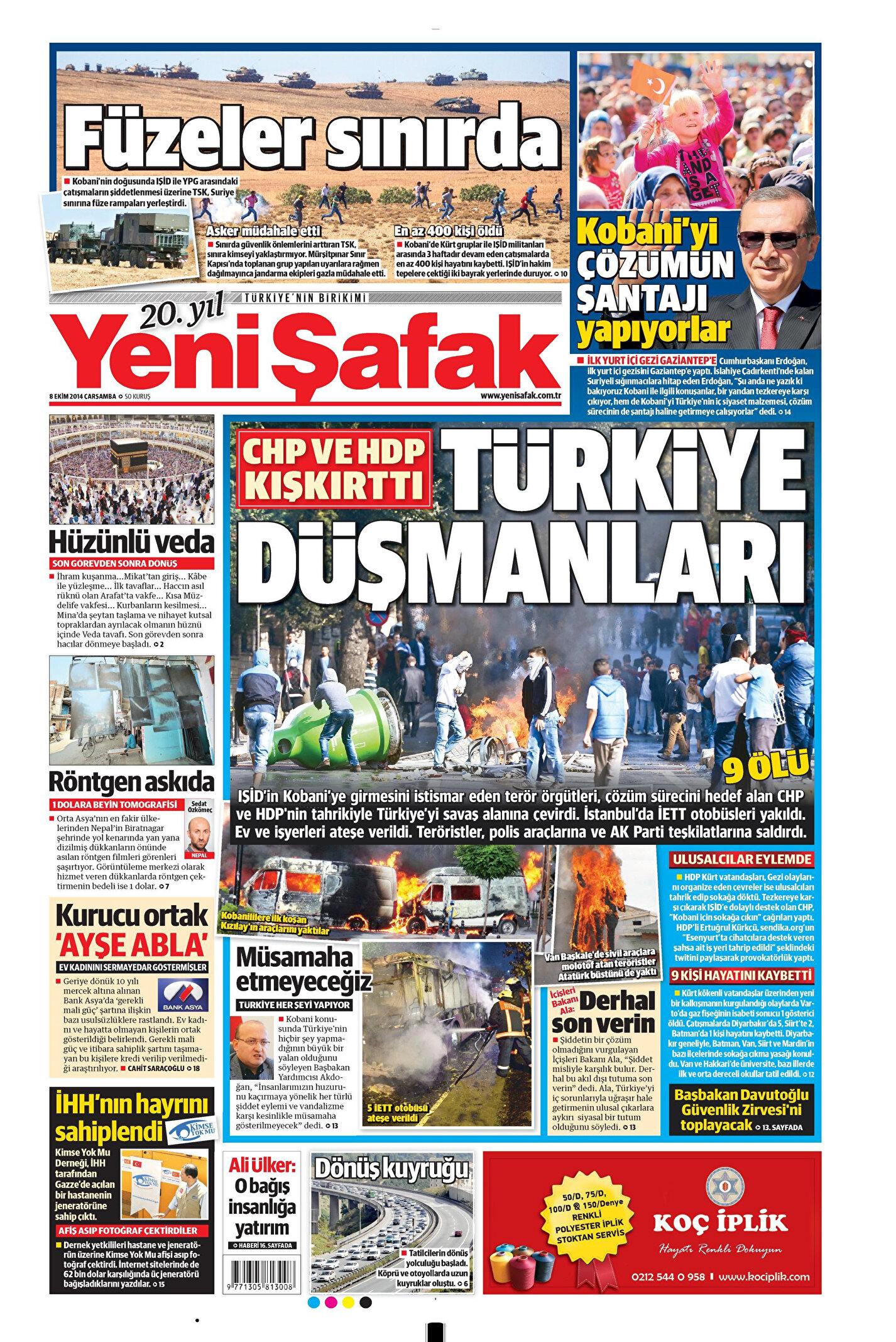 DEAŞ’ın Ayn el Arab’a (Kobani) girmesini istismar eden terör örgütleri, çözüm sürecini hedef alan CHP ve HDP’nin tahrikiyle Türkiye’yi savaş alanına çevirdi. 8 Ekim’de “Türkiye düşmanları” manşetiyle çıkan Yeni Şafak, büyük resmi okuyucuyla buluşturdu. HDP Kürtleri, Gezi olaylarını organize eden çevreler ise ulusalcıları tahrik edip sokağa dökmüştü. Kürtler üzerinden yeni bir kalkışmanın kurgulandığı olaylarda “Kobani için sokağa çıkın” çağrısı yapıldı. 7-12 Ekim tarihleri arasında 46 kişi öldü, 682 kişi de yaralandı.
