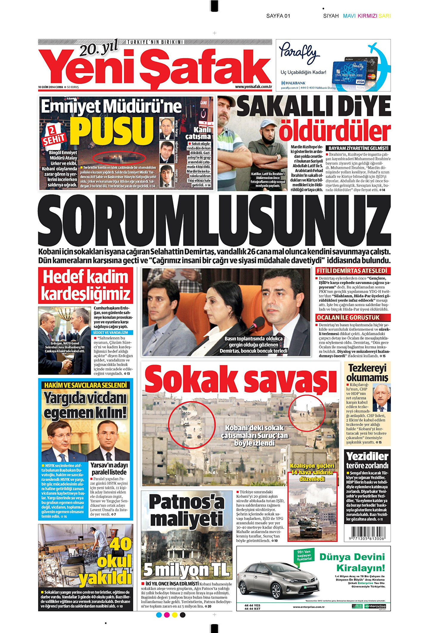 Sokakları isyana çağıran dönemin HDP Eş Genel Başkanı Selahattin Demirtaş, onlarca kişinin ölmesinin ardından kendini savunmaya çalıştı. Kameraların karşısına geçip “Çağrımız insani bir çağrı ve siyasi müdahale davetiydi” diyen Demirtaş’a en iyi cevabı ertesi gün Yeni Şafak 9 sütuna attığı manşetle verdi: Sorumlusunuz!