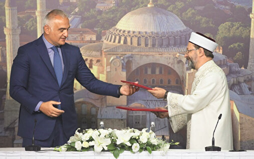 Kültür ve Turizm Bakanlığı ile Diyanet İşleri Başkanlığı arasında Ayasofya Camisi’nde yürütülecek koruma, geliştirme, tanıtım ve yönetim faaliyetlerine ilişkin protokol imzalandı. “Ayasofya-i Kebir Camii Şerifi’nde Yürütülecek Koruma, Geliştirme, Tanıtım ve Yönetim Faaliyetlerine İlişkin İş Birliği Protokolü”nün imza töreni, Diyanet İşleri Başkanlığı Dini Yayınlar Konferans Salonu’nda yapıldı. Protokolle ilgili de özel açıklamalar yapan Erbaş, “Bu protokolde, Vakıflar Genel Müdürlüğü, Kültür Varlıkları Genel Müdürlüğü, Müzeler Genel Müdürlüğü ve Diyanet İşleri Başkanlığı var. Dolayısıyla daha fazla koruma, sahip çıkma durumu hasıl oluyor. Belki müze olduğu dönemlerden daha fazla şu anda sahip çıkılacaktır” dedi.