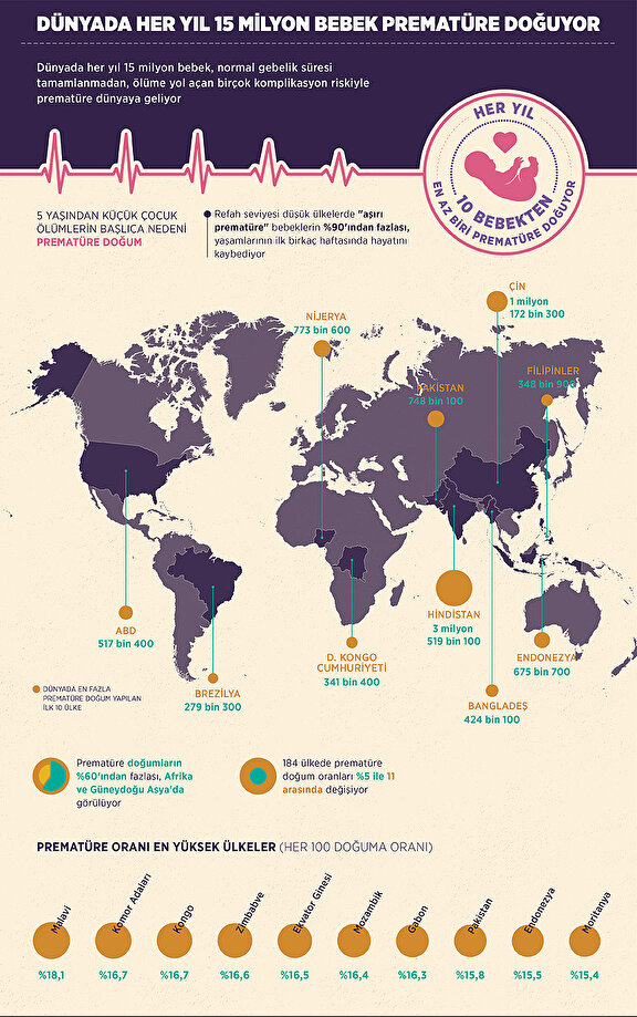 Dünyada en fazla prematüre doğum yapılan ilk 10 ülke şöyle sıralanıyor; Hindistan 3 milyon 519 bin 100, Çin 1 milyon 172 bin 300, Nijerya 773 bin 600, Pakistan 748 bin 100, Endonezya 675 bin 700, ABD 517 bin 400, Bangladeş 424 bin 100, Filipinler 348 bin 900, Kongo Demokratik Cumhuriyeti 341 bin 400 ve Brezilya 279 bin 300.