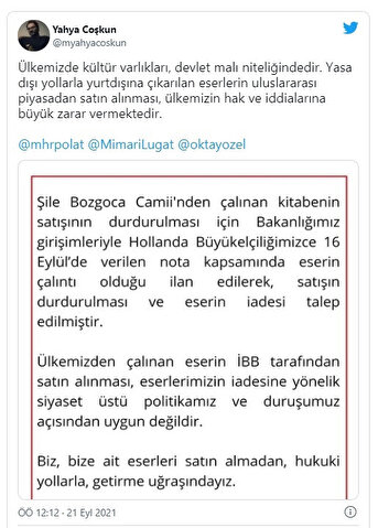 Kültür Varlıkları ve Müzeler Genel Müdür Yardımcısı Yahya Coşkun da bu olaya twitter hesabından tepki gösterdi. Coşkun, "Ülkemizde kültür varlıkları, devlet malı niteliğindedir. Yasa dışı yollarla yurtdışına çıkarılan eserlerin uluslararası piyasadan satın alınması, ülkemizin hak ve iddialarına büyük zarar vermektedir." ifadelerini kullandı.