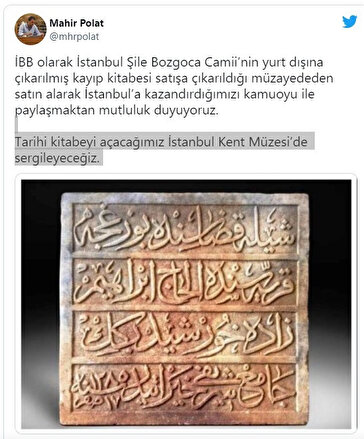 Polat, twitter'dan yaptığı paylaşımda, "İBB olarak İstanbul Şile Bozgoca Camii’nin yurt dışına çıkarılmış kayıp kitabesi satışa çıkarıldığı müzayededen satın alarak İstanbul’a kazandırdığımızı kamuoyu ile paylaşmaktan mutluluk duyuyoruz. Tarihi kitabeyi açacağımız İstanbul Kent Müzesi’de sergileyeceğiz" dedi.