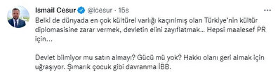 Cumhurbaşkanı Recep Tayyip Erdoğan’ın danışmanı İsmail Cesur, söz konusu eserin iadesi için diplomatik çalışmaların sürmesine rağmen İBB’nin “şımarık çocuk” gibi davrandığını öne sürdü: