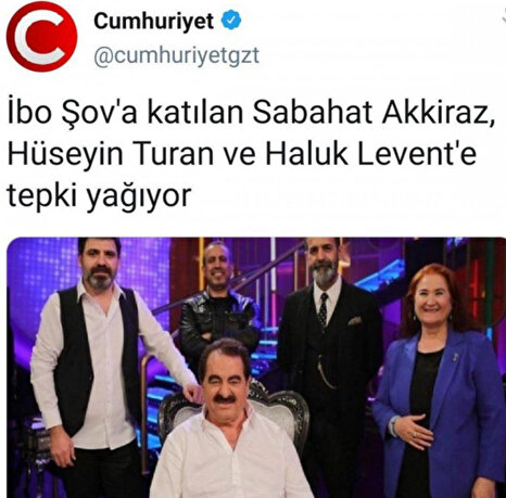 İbo Show'a konuk olan Sabahat Akkiraz, Hüseyin Turan ve Haluk Levent, muhalifler tarafından linç ediliyor. Sosyal medyada başlatılan linç kampanyasına Cumhuriyet gazetesi de desteğini gösterdi.