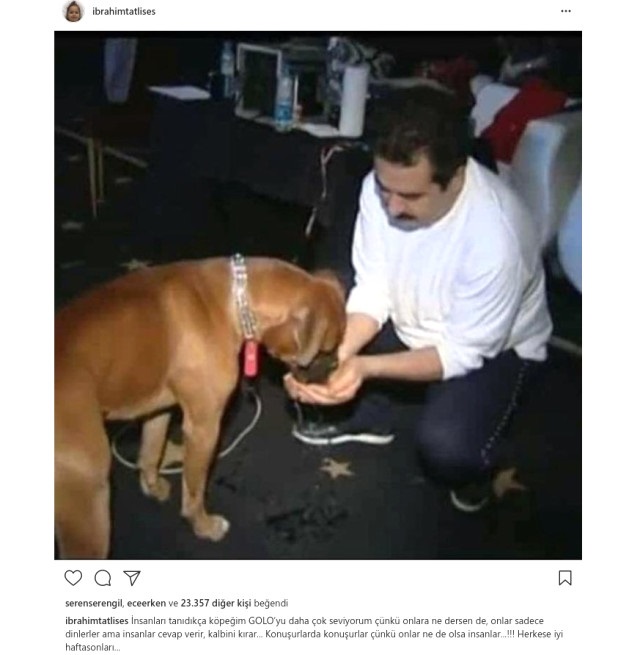 İmparator İbrahim Tatlıses sosyal medya hesabından köpeği Golo'lu paylaşımının altına sitemli sözler yazdı. Tatlıses, "İnsanları tanıdıkça köpeğim Golo'yu daha çok seviyorum, çünkü onlara ne dersen de sadece dinlerler, ama insanlar cevap verir kalbini kırar. Konuşurlar da konuşurlar çünkü insanlar. Herkese iyi hafta sonları" notunu paylaştı.