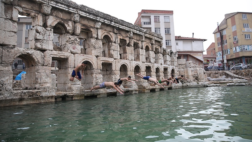 İlçede çalışmalarını yürüten yüzücüler, kış mevsimi olmasına karşın, su sıcaklığıyla uygun bir ortam oluşturan havuzda, iki bin yıllık tarihle iç içe yüzme imkanı buldu.