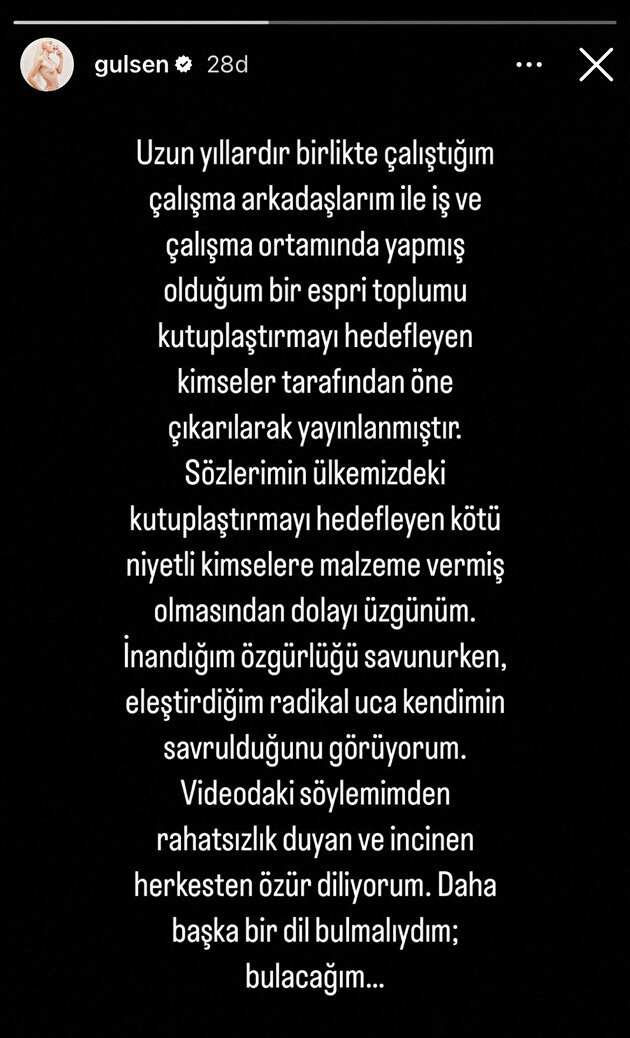İmam hatiplileri hedef alan açıklaması nedeniyle infiale neden olan şarkıcı Gülşen özür diledi. Özür açıklamasında "Kötü niyetli kişilere malzeme verdim" diyen Gülşen, "Söylemimden rahatsız olan herkesten özür dilerim. Daha başka bir dil bulmalıydım" dedi.