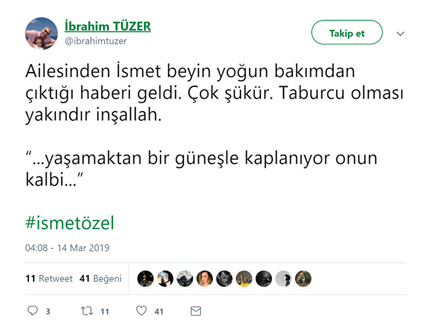 Kalp rahatsızlığı dolayısıyla tedavi gören Türk edebiyatının önemli şairlerinden İsmet Özel'den sevindirici haber geldi. Özel, yoğun bakım servisinden çıktı.