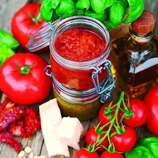MALZEMELER: l 200 g kurutulmuş domates l 60 g taze fesleğen yaprağı l 80 g badem l 2 diş sarımsak l 100 g parmesan peyniri l 200 ml sızma zeytinyağı l 2 çay kaşığı kırmızı pul biber l 1 fiske tuz