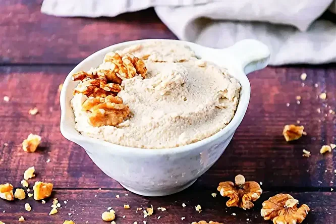 MALZEMELER: l 200 g ceviz içi l 2 diş sarımsak l 100 g parmesan peyniri l 5 dilim ekmek içi l 200 ml sızma zeytinyağı l 1 çay bardağı krema l Bir fiske tuz l Bir fiske taze kekik l 1 su bardağı süt