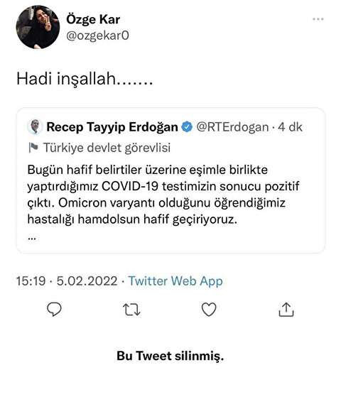 Karar gazetesinin internet editörü Özge Kar, Cumhurbaşkanı Recep Tayyip Erdoğan'ın koronavirüs testinin pozitif çıktığını duyurduğu tweetini alıntılayarak “Hadi İnşallah” ifadesini kullandı. Editör Kar, daha sonra tweeti silerek hesabını kapattı.