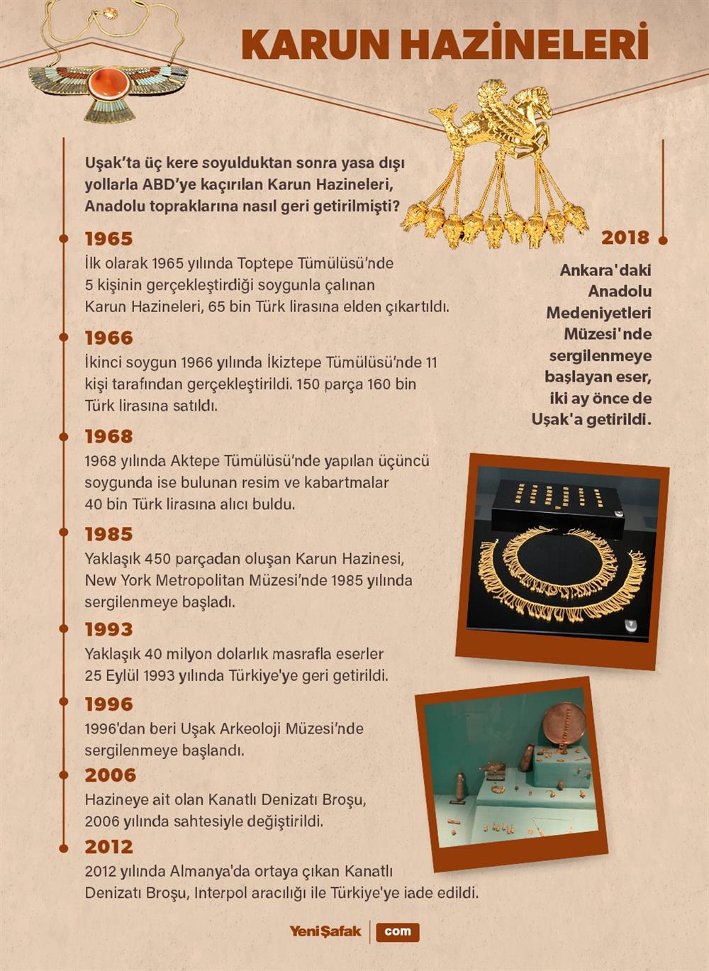 25 yıl önce bugün Lidya Kralı Krezüs’ ait olduğu varsayılan ve çokluğundan dolayı Karun Hazineleri olarak bilinen hazineler Türkiye getirildi. Karun Hazineleri’nin başına gelenler, hazinenin değerinin ne kadar da paha biçilemez olduğunu gösteriyor. Uşak’ın Güre beldesi yakınlarındaki Tekin Köyü'nden bulunan Karun Hazineleri, 1965- 1968 yılları arasında çıkarılarak yasadışı yolla yurtdışına kaçırıldı ve New York Metropolitan Müzesi’ne satıldı. ABD’den tekrar geri alınıp ait oldukları Anadolu topraklarına 25 Eylül 1993 yılında kavuşan Karun Hazineleri’nin başından geçenler aksiyon filmlerini aratmayacak cinsten.