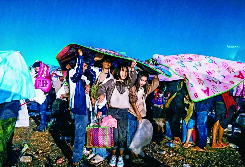 Myanmar’ın Kuzeydoğu Shan Eyaleti’nde sağanağın altında, battaniyelere ve naylon örtülere sarılarak ışık festivalinin büyüsünü korumaya çalışan kalabalık, sırılsıklam olmuş bedenleriyle gülümsüyor. Dostlarla bir arada olmak yağmurun serinliğini sıcaklaştırıyor. (Sai Aung MAIN / AFP)