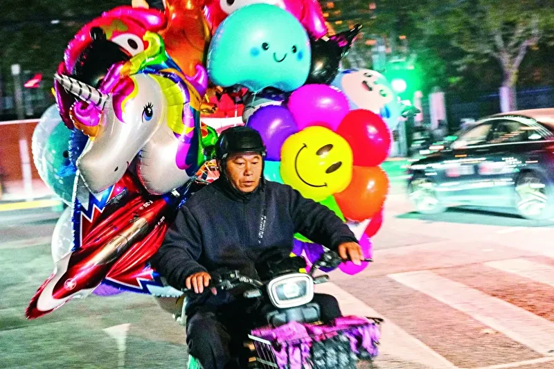 Kalabalığın ve gökdelenlerin arasında, rengârenk balonlarla dolu motorunu süren satıcı, şehrin griliğine inat bir parça çocukluk, bir tutam neşe taşıyor; her geçişinde rüzgârla savrulan balonlar, insanların unutmak üzere oldukları umutları yeniden hatırlatıyor. (Hector RETAMAL / AFP)
