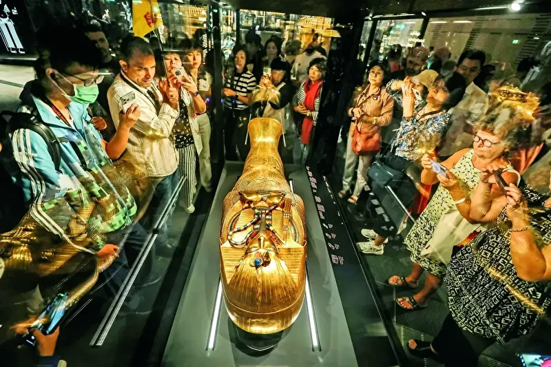 Binlerce yıl önce dokuz yaşında taç giyip on dokuzunda hayata veda eden genç Kral Tutankamon’un altınla mühürlenmiş sessizliğine bugün onlarca göz bakıyor; o altın tabutun parıltısında sadece geçmişin görkemi değil, insanın zamana karşı bitmeyen var olma arayışı yankılanıyor. (AA / Mohamed Elshahed)