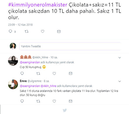 ATV ekranlarından Murat Yıldırım'ın sunduğu Kim Milyoner Olmak İster'in 12 Kasım Pazartesi akşamı yayınlanan yeni bölümündeki ilginç matematik sorusu sosyal medyayı karıştırdı. 'Bir çikolata ve bir sakızın toplam fiyatının 11 lira olduğu markette, çikolata sakızdan 10 lira daha pahalıysa sakızın fiyatı nedir?' sorusuna yarışmacı doğru cevap veremedi. Soru, saatlerce Twitter'da konuşuldu.