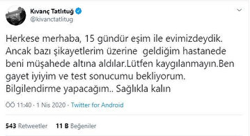 Tatlıtuğ'u sosyal medya hesabından şu açıklamayı yaptı: "Herkese merhaba, 15 gündür eşim ile evimizdeydik. Ancak bazı şikayetlerim üzerine geldiğim hastanede beni müşahede altına aldılar. Lütfen kaygılanmayın. Ben gayet iyiyim ve test sonucumu bekliyorum. Bilgilendirme yapacağım.. Sağlıkla kalın."