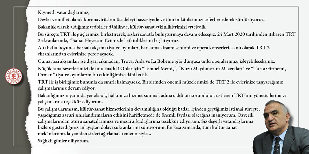 24 Mart tarihinden itibaren TRT 2 ekranlarında, 'Sanat Heyecanı Evimizde' etkinliklerini başlattıklarını duyuran Ersoy, "6 hafta boyunca her salı akşamı tiyatro oyunları, her cuma akşamı senfoni ve opera konserleri, canlı olarak TRT 2 ekranlarından evlerinize perde açacak. Cumartesi akşamları ise dışarı çıkmadan Troya, Aida ve La Boheme gibi dünyaca ünlü operalarımızı izleyebileceksiniz" diyerek çocuklar içinde bir yayın akışı olduğunu söyledi: