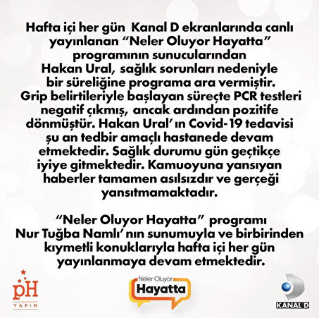 Ünlü sunucu Hakan Ural, geçen günlerde sosyal medya hesabından yaptığı paylaşımla hasta olduğunu belirterek sevenlerinden dua istemişti. Sağlık durumundan bahseden Ural, "Her geçen gün daha da zorlaştı" demişti. Sunuculuğunu yaptığı 'Neler Oluyor Hayatta' programından açıklama geldi. Yapılan açıklamada Hakan Ural'ın koronavirüse yakalandığı tedbir amaçlı hastanede olduğu duyuruldu.