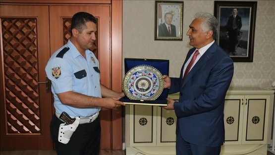 Malatya'da, köpeğe avucuyla su içirirken çekilen videoyla gündeme gelen trafik polisi Seyit Kurtulmuş'a, İl Emniyet Müdürü Ömer Urhal ve Malatya Büyükşehir Belediyesi Kent Konseyi tarafından ödül verildi.