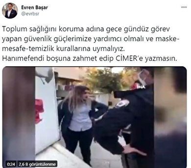 Cumhurbaşkanlığı İletişim Dairesi Başkanlığı Halkla İlişkiler Dairesi Başkanı Evren Başar, maske takmayan kadının polislere verdiği tepkinin görüntülerini sosyal medya hesabından paylaştı. İnsanların maske, temizlik ve sosyal mesafe kurallarına uyması gerektiğini ifade eden Başar, "Toplum sağlığını koruma adına gece gündüz görev yapan güvenlik güçlerimize yardımcı olmalı ve maske-mesafe-temizlik kurallarına uymalıyız. Hanımefendi boşuna zahmet edip CİMER'e yazmasın" şeklinde yanıt verdi.