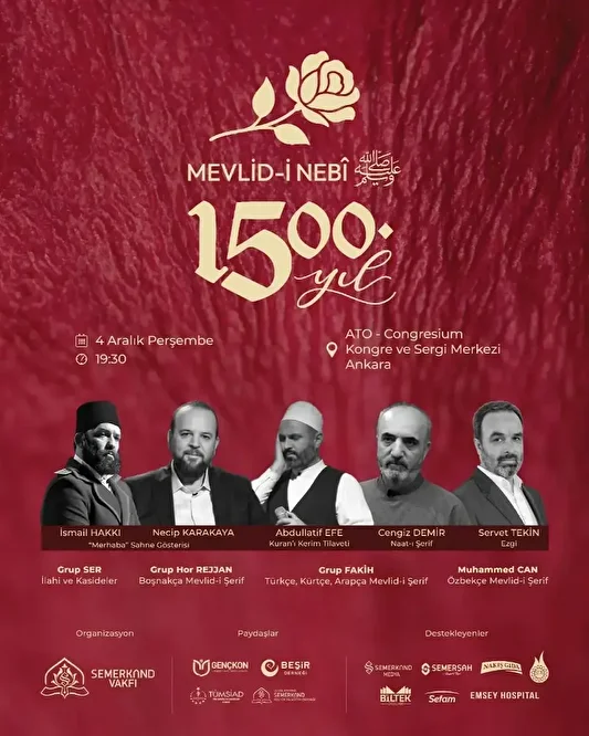 Etkinlik: Mevlid-i Nebî 1500. Yıl – Ankara Buluşması Tarih: 4 Aralık 2025 Saat: 19.30 Yer: ATO Congresium Kongre ve Sergi Merkezi – Ankara Katılım: Halka açık ve ücretsizdir.