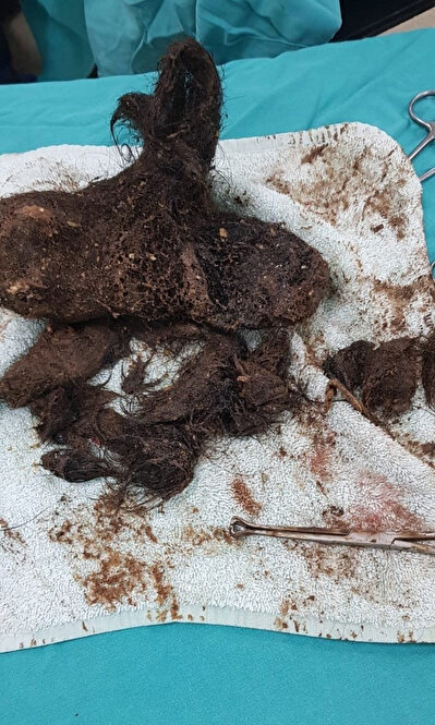 Tıpta ‘trikobezoar’ adı verilen, kıl yeme alışkanlığına bağlı olarak midede taşlaşmış bir kıl kütlesine rast gelen doktor, hastanın midesindeki yaklaşık 700 gramlık kıl kütlesini çıkardı.
