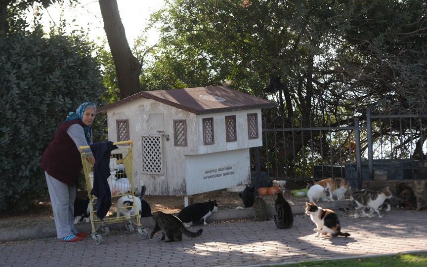 "5 yıldır Antalya'dayım. Daha önce yaşadığım Hatay'da da sokak kedilerinin karnını doyuruyordum. Buraya geldikten sonra 5 kilometrelik yürüyüş yolumdaki kedi ve köpekleri beslemeye başladım. Alışveriş sepetinin tekerleklerinin gıcırtısını duyan hemen önüne atlıyor. Bir keresinde benim geçtiğim saatlerde benden önce bir bebek arabası ilerliyordu yolda. Onun sesini duyunca benim geldiğimi sanıp başına üşüştüler ama beni göremeyince hayal kırıklığıyla geri döndüler.