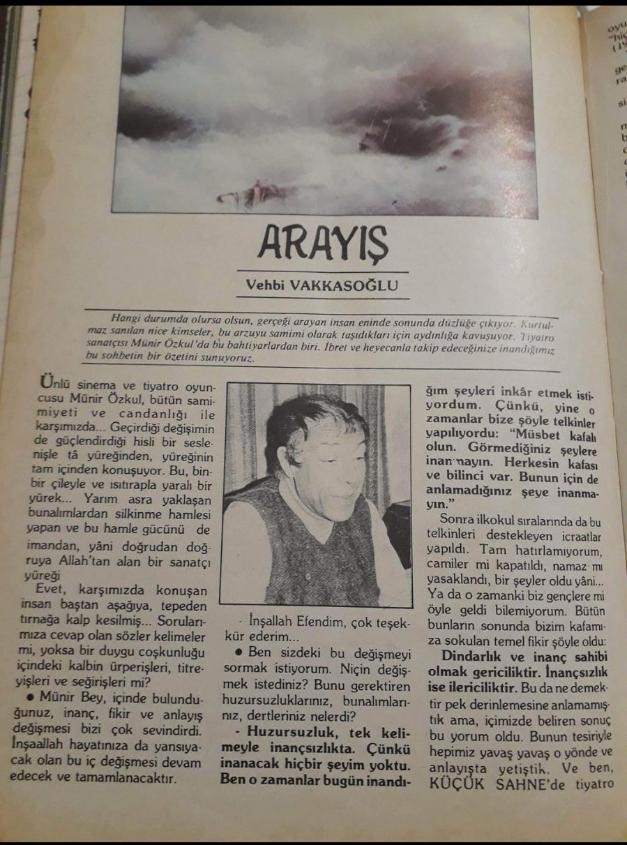 başlığını koyduğu Münir Özkul söyleşisini okuyucusuna şu cümlelerle takdim ediyor: “Hangi durumda olursa olsun, gerçeği arayan insan eninde sonunda düzlüğe çıkıyor. Kurtulmaz sanılan nice kimseler, bu arzuya samimi olarak taşıdıkları için aydınlığa kavuşuyor. Tiyatro sanatçısı
