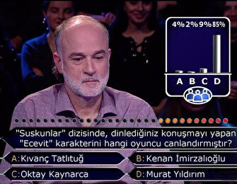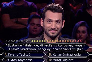 'Suskunlar' dizisinde Ecevit karakterini hangi oyuncu canlandırmıştır? sorusunun cevabı Murat Yıldırım'dı. Ünlü sunucu şıkkı okuduktan sonra çok şaşırdı. Yarışmacı seyirci joker hakkını kullanarak soruyu doğru cevapladı.