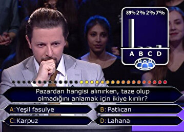 "Pazardan hangisi alınırken, taze olup olmadığını anlamak için ikiye kırılır?" sorusunun cevap şıkları arasında "yeşil fasulye, patlıcan, karpuz, lahana" yer aldı. "Bir fikrim var ama emin olamıyor, riske atmak istemiyorum" diyen yarışmacı seyirci joker hakkını kullandı.