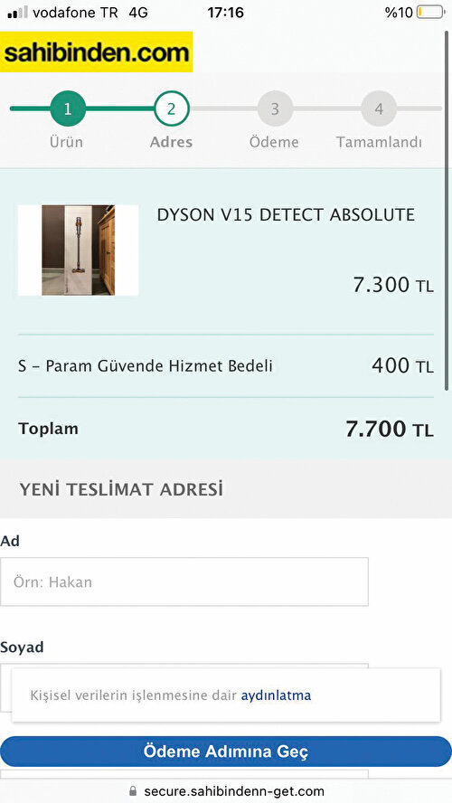 B.A’yla anlaşan dolandırıcı, ödemeyi ‘https://secure.sahibindenn-get.com/param-guvende/odeme-yap/step.php?id=dyson-v15-detect-absolute-10659157245’ adlı adrese beş dakika içerisinde yapmasını, dekontu gönderdikten sonra eşinin kargoya vereceğini söyledi. Bu linke tıklayan B.A 7 bin 700 TL’yi yatırdı. Parayı yatırdıktan sonra B.A internet sitesinin adresinin sonunda 2 "n" ile taklit edildiğini fark etti. Para havale olduktan sonra dolandırıcı I.G telefon numarasını iptal ederek ortalıktan kayboldu.