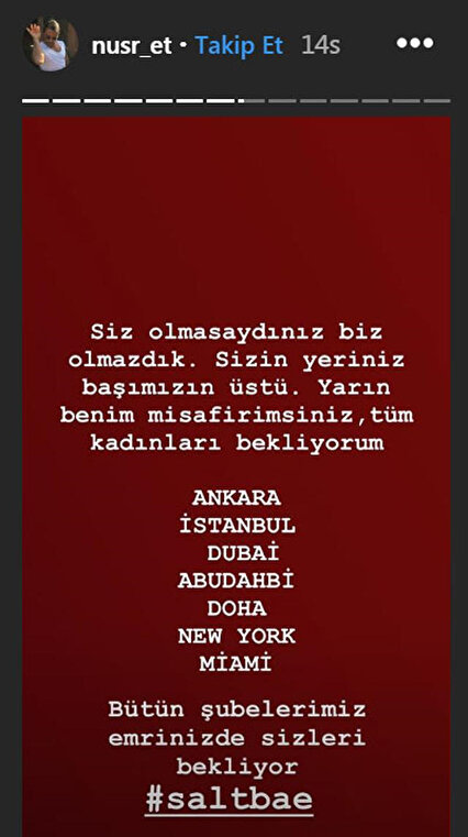 Nusret Gökçe dün Instastoryden, "Siz olmasaydınız biz olmazdık. Sizin yeriniz başımızın üstü. Yarın benim misafirimsiniz tüm kadınları bekliyorum" notunu paylaşarak tüm kadınları şubelerine davet etti.