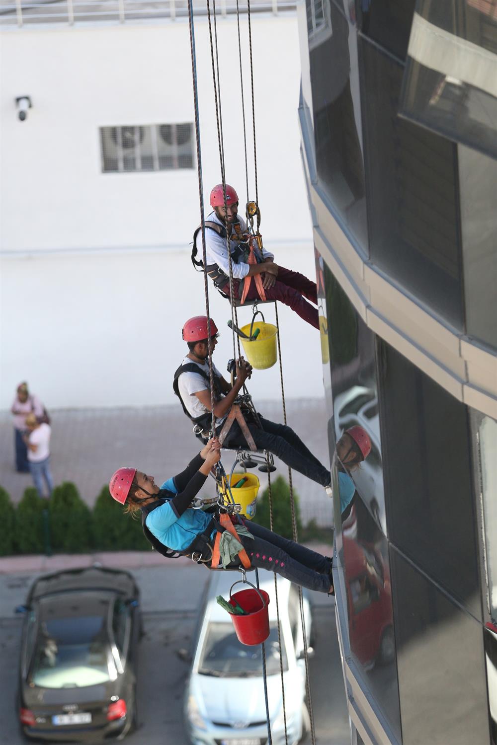 Kayseri'de iki çocuğunu kimseye muhtaç olmadan büyütmek için özel bir temizlik firmasında çalışan Leyla Alkan, kentteki yüksek katlı binaların dış cephe temizliğini çatılardan sarkıtılan halata tutunarak yapıyor.