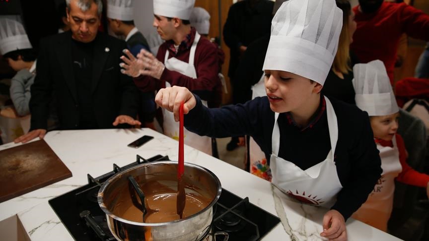 Çikolata ustalarından teorik bilgi alan öğrenciler, aşçı önlükleri ve şapkalarını giyerek çikolata kazanının başına geçti. Mutlulukları gözlerinden okunan otizmli çocuklar, yaptıkları çikolataları erittikten sonra farklı kalıplara koyarak şekil almalarını sağladı.