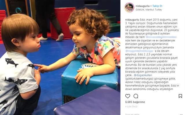 - "Ediz, Mart 2015 doğumlu yani şu anda 3 yaşında. Doğumundan sonra hastaneden çıktığımız andan itibaren onun eğitimi için her zaman ne yapabileceğimizi düşündük. 8 aylıktan itibaren de fizyoterapi ile birlikte ev destekleriyle elimizden geldiğince eğitimini aksatmamaya çalışıyoruz. Ediz; 2-2,5 yaşındaki normal gelişim gösteren çocuklarla bir arada gayet uyum içerisinde derslerini yapabilir durumda. Biz de bundan yola çıkarak; yeni dönemde bir ana okuluna başlaması için kayıt yaptırmaya gittik. Okuldaki yetkili kişinin Ediz' in down sendromlu olduğunu söylediğim anda ifadesi değişti ve sonra başladı sorguya."