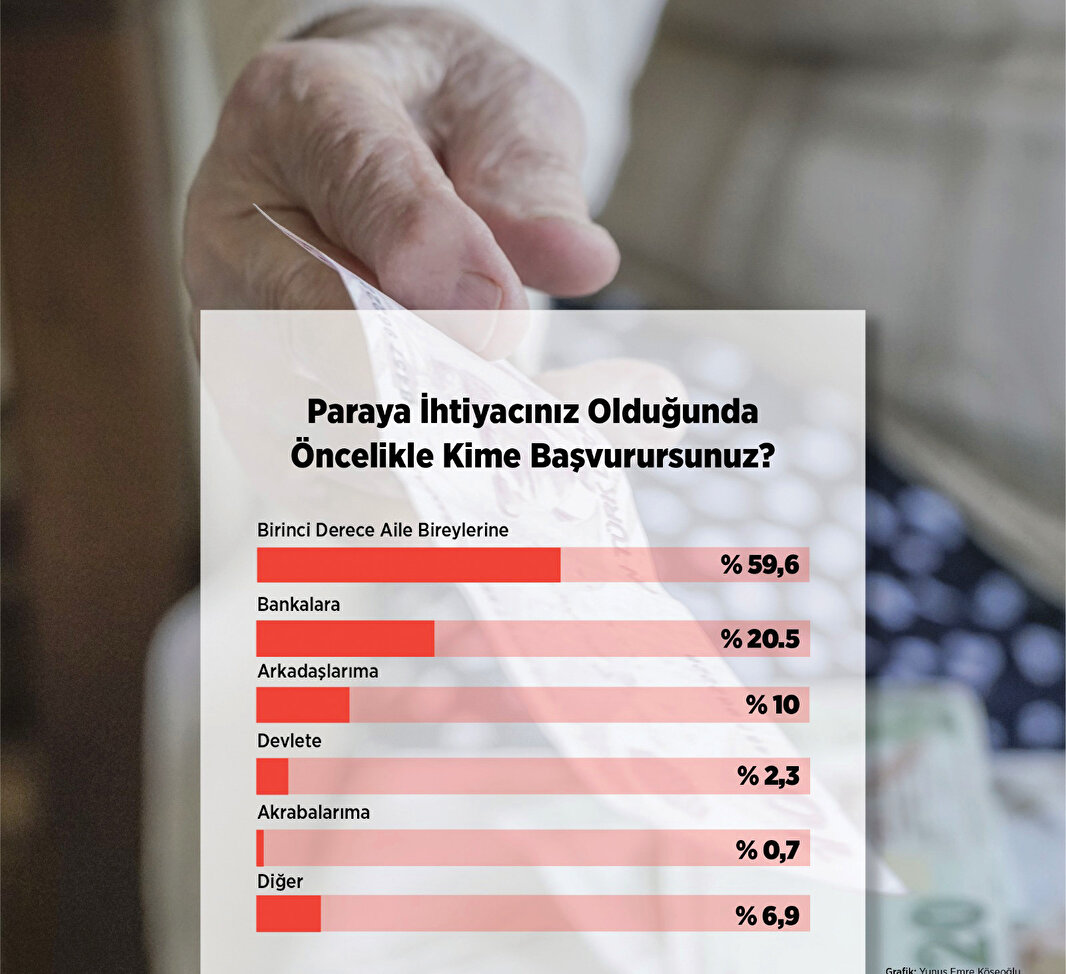 - Araştırmada, maddi ihtiyaç durumunda kimden yardım alındığı konusu da katılımcılara soruldu. “Paraya ihtiyacınız olduğunda öncelikle kime başvurursunuz?” sorusuna, birinci derece aile bireylerine diyenlerin oranı yüzde 59,6 olurken, bankalara diyenler yüzde 20,5, arkadaşlarıma diyenler yüzde 10, devlete başvuracağını söyleyenler yüzde 2,3, akrabalarıma diyenlerin orası ise 0,7 oldu.