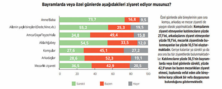 Araştırmaya göre, bayramlarda ve özel günlerde yapılan ziyaretlere bakıldığında katılımcıların büyük çoğunluğunun anne ve babaları başta olmak üzere ailenin yaşlı bireylerini ziyaret ettiği anlaşılıyor. Bu tür ziyaretleri sürekli veya bazen gerçekleştirenlerin oranının da yüzde 80’i aştığı görülüyor. Elde edilen sonuçlara göre, yine katılımcıların yüzde 59,5’i gününün en az 8 saatini ailesiyle birlikte geçiriyor. Aynı zamanda verilere göre katılımcıların yüzde 96,9’u, yaşlandıkları zaman anne veya babalarına bakmakla yükümlü olduğunu düşünüyor.