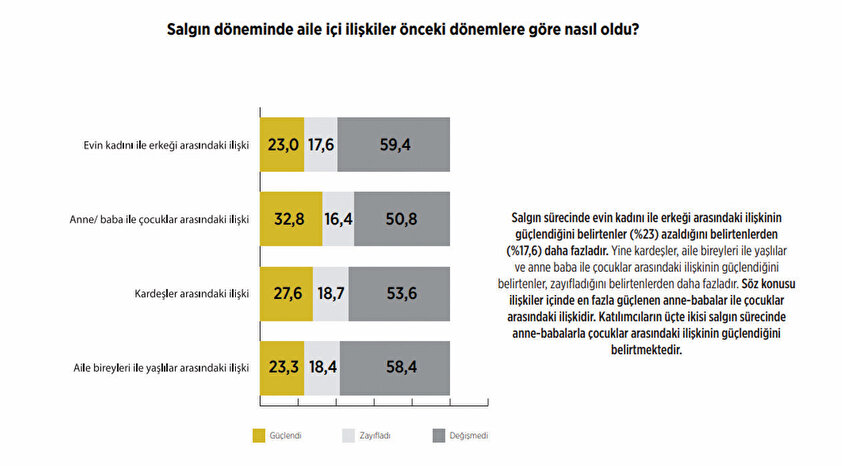 Salgın sürecinde aile kavramı da araştırıldı. Katılımcılara sorulan “Salgın döneminde aile içi ilişkiler önceki dönemlere göre nasıl oldu?” sorusuna, katılımcıların yüzde 23’ü güçlendiğini, yüzde 32,8’inin anne-baba ile çocuklar arasındaki ilişkinin güçlendiğini belirtirken, yüzde 27,6’sı kardeşler arasındaki ilişki, yüzde 23,3’ü ise aile bireyleri ve yaşlılar arasındaki ilişkinin güçlendiğini ifade etti.
