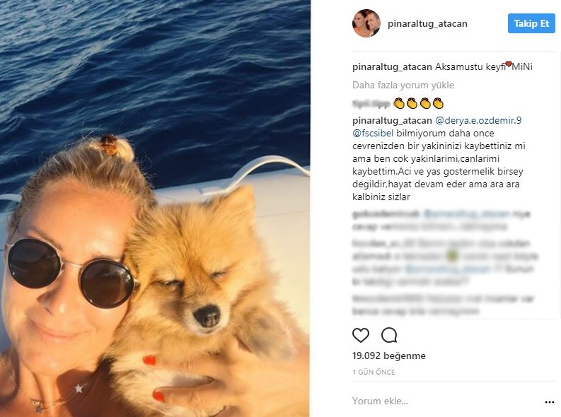 Pınar Altuğ bir başka takipçisine de cevaben "Ne giydiğimin ne yaptığımın hesabını kimseye vermem,siz kim olarak bu yorumu yapabiliyorsunuz onu anlayamadım? Beni sevmiyor, beğenmiyor olabilirsiniz saygı duyarım ama o zaman da sayfamda işiniz ne diye sorarım malum şahsi sayfam. Bu arada üzüntü göstermelik değildir kalpte yaşanır!" dedi.