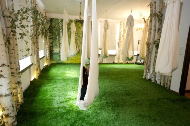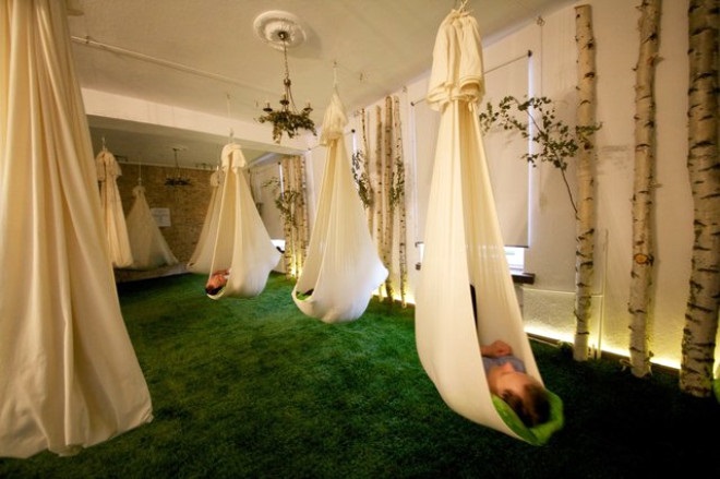 İnsanı dinlendirmeye yardımcı olan yeşilin tonlarında dekore edilen kafede müşteriler gevşemenin ilk adımı olarak ayakkabılarını çıkarıyor. Çim halı kaplı kafede yalınayak gezen müşteriler daha sonra kişiye sarmalanma hissi veren tavana asılmış hamaklara uzanıyor.