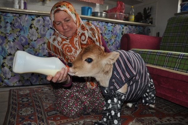 Vücut ısısının sağlanması için dikilen özel elbiseler giydirilen ’Ceylan’ adındaki buzağı bir gün sonra ayaklanarak yürümeye başladı. Elbiseleriyle büyük ilgi çeken buzağı, yetiştiricisi ve aile tarafından bir bebek gibi bakılıyor.