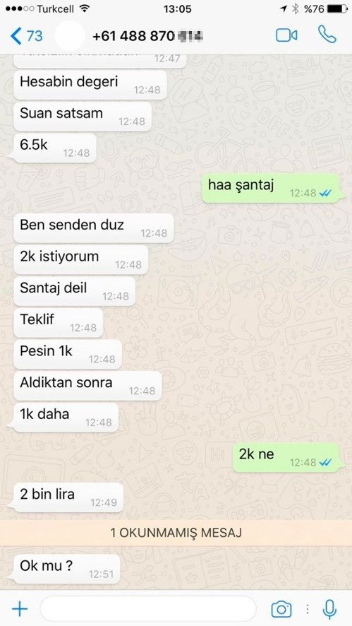 Seda Akgül de şantajla kendisinden 2 bin lira isteyen hacker ile yaptığı wathsApp görüşmesinin fotoğrafını yayınladı.