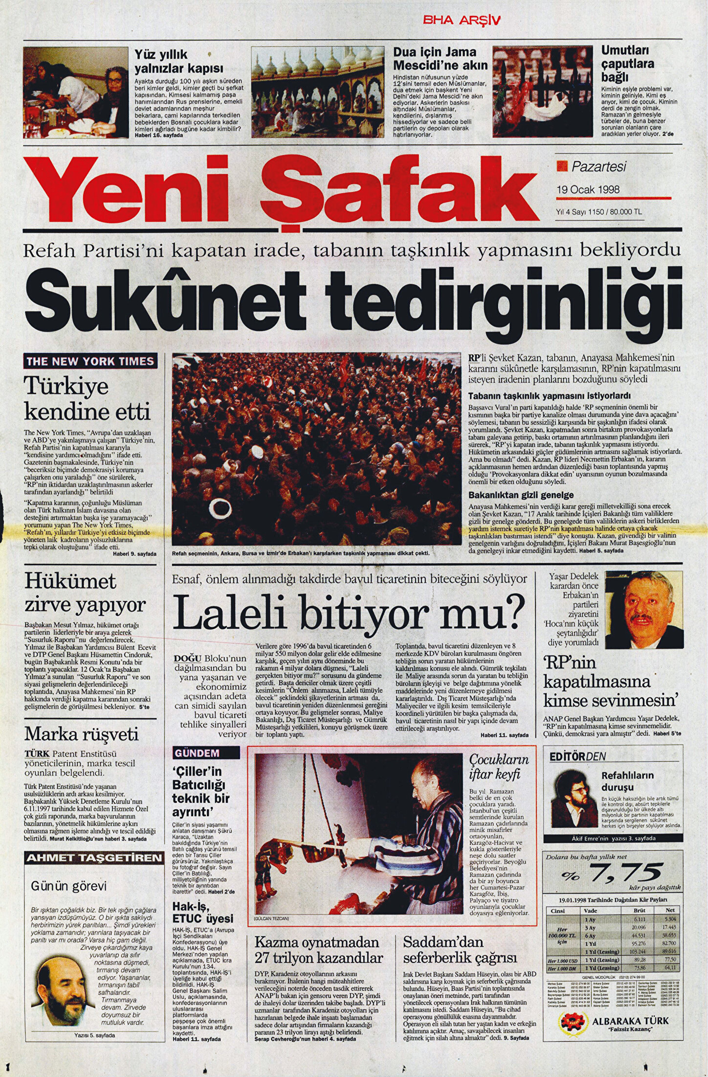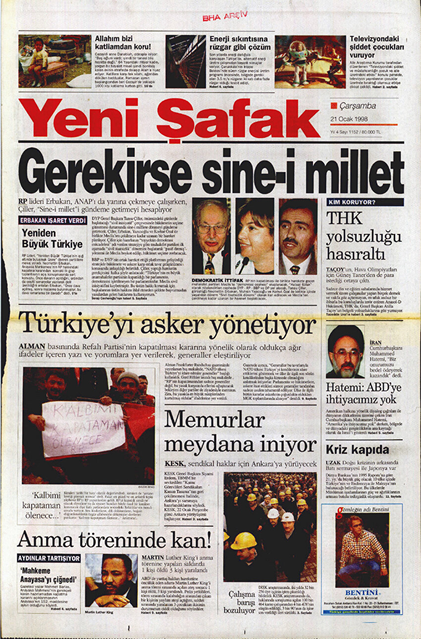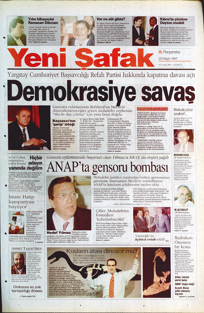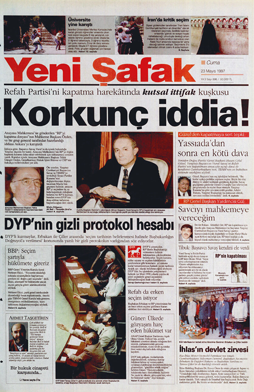 - Kapatma davasının siyasete damga vurduğu bu dönemde duruşu ile öne çıkan Yeni Şafak, bu yöndeki ilk duyumlara tepkisini 22 Mayıs 1997’de ‘Demokrasiye Savaş’ başlığıyla gösterdi. RP’ye kapatma davasının konuşulduğu günlerde bir diğer başlığımız ise ‘Korkunç İddia’ oldu. Haberin detayında ise Refah Partisi’ni kapatma harekatında kutsak ittifak kuşkusunun detaylarını paylaştık. Anayasa Mahkemesi’ne gönderilen ‘RP’yi kapatma dosyası’nın Mahkeme Başkanı Yekta Güngör Özden ve bir grup general tarafından hazırlandığı iddiasını okuyucularımıza duyurduk.