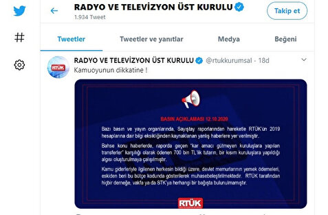 - "Bazı basın ve yayın organlarında Sayıştay raporlarından hareketle RTÜK'ün 2019 hesaplarına dair bilgi eksikliğinden kaynaklanan yanlış haberlere yer verilmiştir. Bahse konu haberlerde, raporda geçen 'kar amacı gütmeyen kuruluşlara yapılan transferler' karşılığı olarak ödenen 700 bin liralık tutarın, bir kısım kuruluşlara yapıldığı algısı oluşturulmaya çalışılmıştır. Kamu giderleriyle ilgilenen herkesin bildiği üzere devlet memurlarının yemek ödemeleri, eskiden beri bu bütçe kodunda gösterilerek muhasebeleştirilmektedir. RTÜK tarafından hiçbir derneğe, vakfa ya da STK'ya herhangi bir bağışta bulunulmamıştır."