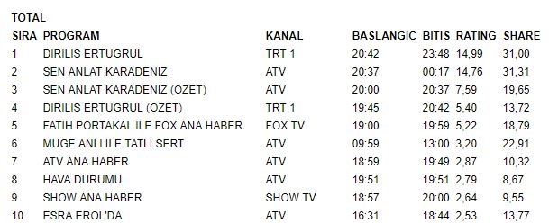 Yaklaşık 3 aydır Total grubunda birinciliği yakalayamayan Diriliş Ertuğrul, bu hafta reyting rekoru kırdı. Saadettin Köpek'in öldüğü sahne ile sosyal medyanın gündemine oturan Diriliş; Total, AB, ABC gruplarında ne yüksek oranı alarak birinci oldu.