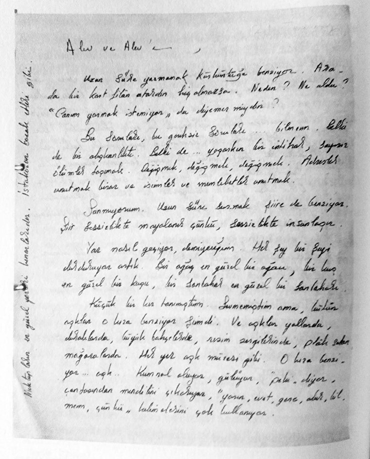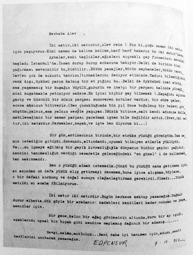 “Sevgili Alev, Nerelerdesin? Bu hafta o kadar az yazdın ki… Hepsi, hepsi iki sayfacık. Sitem etmiyorum. Belki bir suskunluk bir özlem yakınması benimkisi. İnsanın yüreği boş oldu muydu, bütün bencilliğini kullanarak aşkı, sevgiyi yadsımaya kalkıyor. Bir kez de sevdi mi insan bütün kurallar, yasalar, deneyler bir tarafa. Sanat yapıtı gibi bir şey bu sevmek: büyüsü var, tanımı yok…”