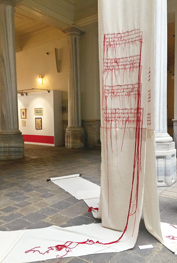 İ.Ü’deki sanatçılardan Cemile Ağaç Yıldırım ise eserini şöyle anlattı. “ ‘İstiklalimizin sembolü olan istiklal marşımız gerçek bir bağımsızlık beyannamesidir’ başlıklı enstelasyon çalışmam ismini bu fikriyattan ediniyor. Eskiden önemli kararlar, bildirgeler insanlara fermanlarla duyurulurdu. İstiklalimizin bildirgesi olarak ilan ettiğimiz marşımızı kumaştan fermanlara kırmızı iplerle nakşettim. Çalışmanın deforme edilmiş, ya da yapım aşamasındaymış gibi duruşu Mehmet Akif Ersoy’un marşımızı yazarkenki ruhani yolcuğuna izleyiciyi katmak, 3 boyutlu bir atmosferde Mehmet Akif Ersoy’a yoldaşlık etmek ziyadesiyle mümkündür.”