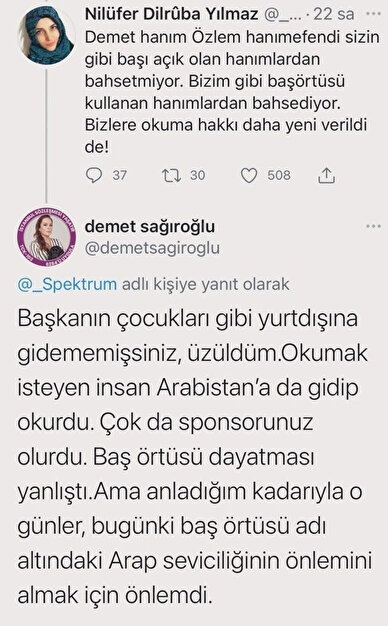 "Başkanın çocukları gibi yurtdışına gidememişsiniz, üzüldüm. Okumak isteyen insan Arabistan'a da gidip okurdu. Çok da sponsorunuz olurdu. Başörtüsü dayatması yanlıştı. Ama anladığım kadarıyla o günler, bugünkü baş örtüsü adı altındaki Arap seviciliğinin önlemini almak için önlemdi"
