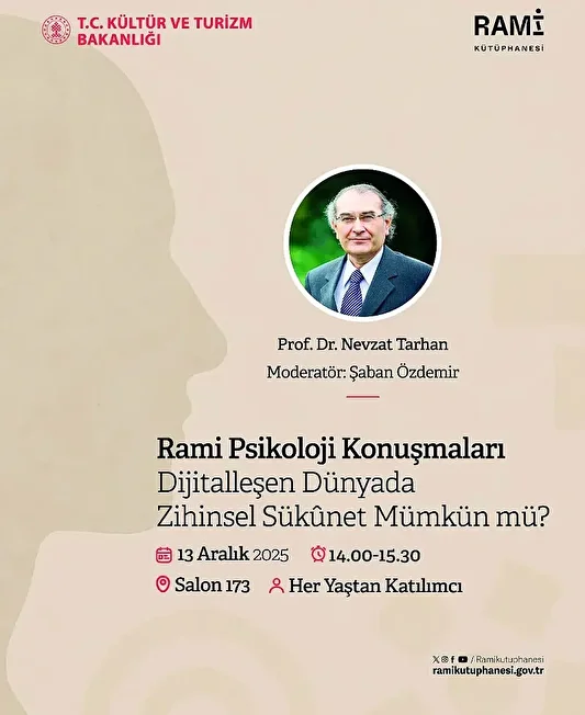 Rami Kütüphanesi, insan ruhunun derinliklerine ışık tutan “Rami Psikoloji Konuşmaları” başlığıyla düzenlenen özel program dizisine ev sahipliği yapmaya devam ediyor. Program boyunca psikiyatristler, akademisyenler ve yazarlar; kader, dijitalleşme, aile yapısı ve psikolojik sağlamlık gibi konular üzerinden insan ruhuna dair derinlikli bir perspektif sunuyor. 13 Aralık’ta Şaban Özdemir’in moderatörlüğünde gerçekleştirilecek programın konuğu Prof. Dr. Nevzat Tarhan olacak. Program, 14.00–15.30 saatleri arasında Salon 173’te gerçekleştirilecek.
